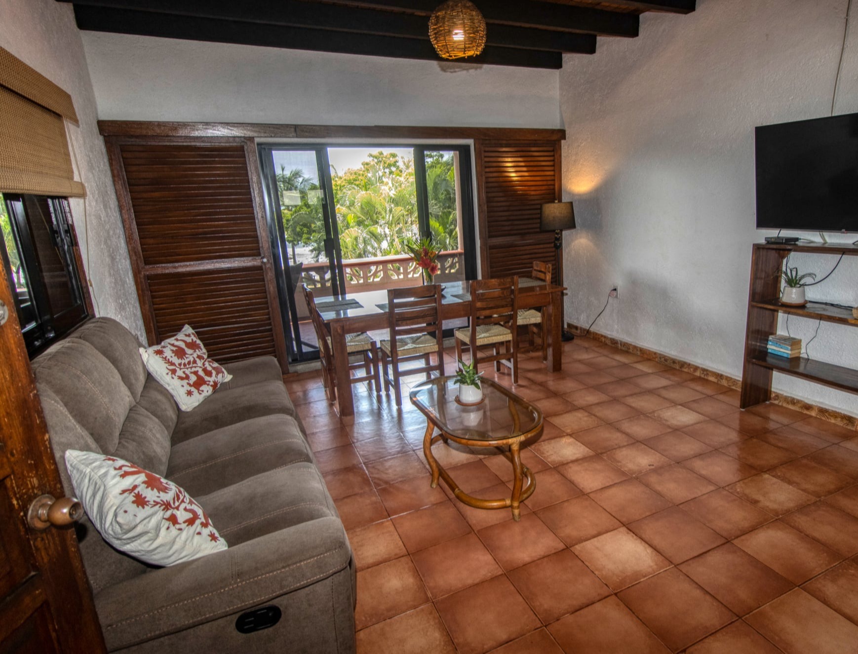 The sand is literally right outside your door at the Beach Casita. On the ground floor, you'll find a bathroom and an open seating area that can be set up as two twin beds or a king-size bed, complete with A/C for comfort. The open-air patio includes a kitchenette and dining space, perfect for relaxing or entertaining.