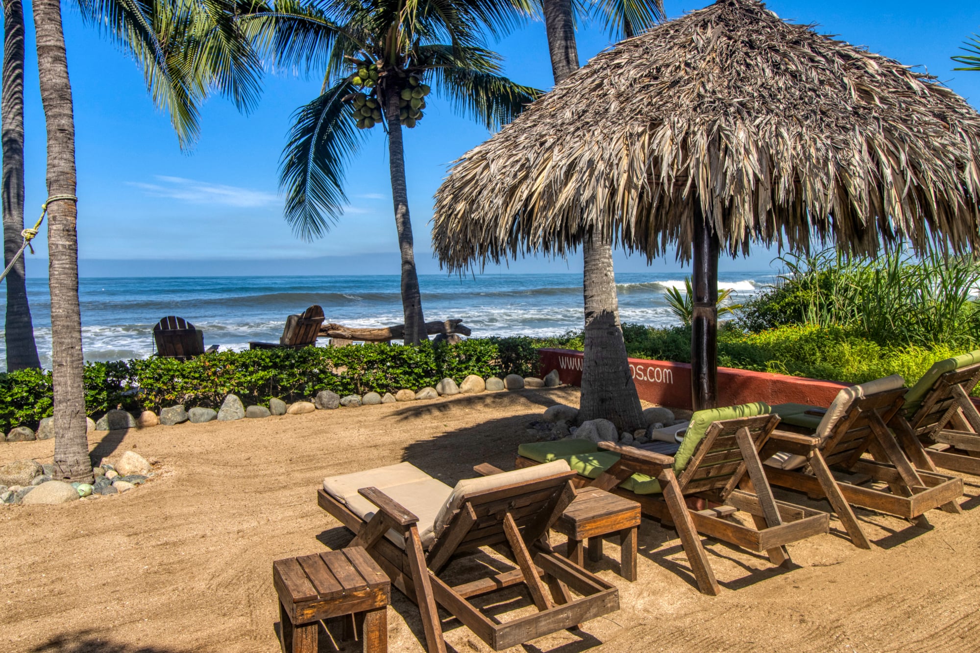 Upstairs, the bedroom loft features a king-sized bed, screened windows, and A/C. Just beyond the patio, enjoy your own private palapa and beach chairs — the ocean is only steps away.